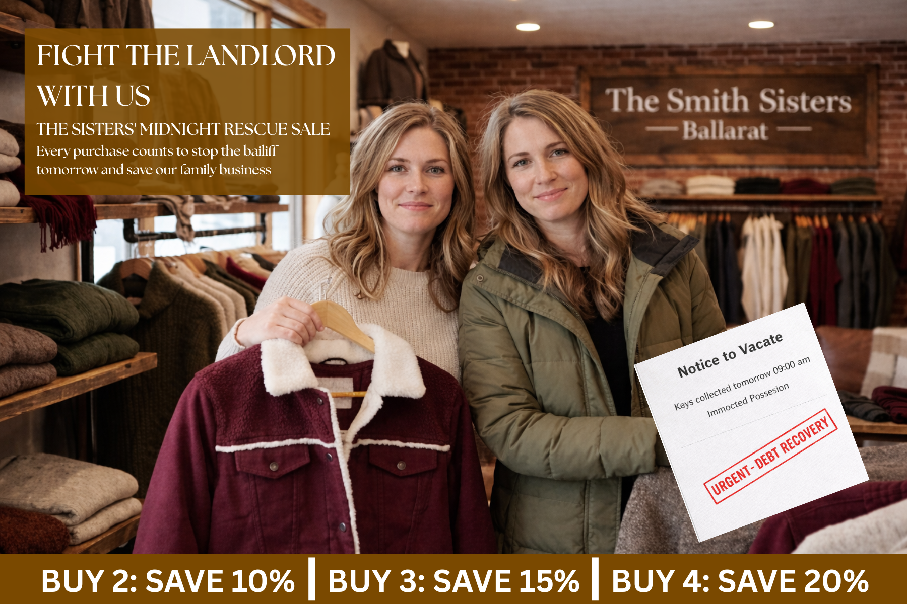 For 14 years, we — The Smith Sisters — have poured our hearts into this warehouse and every piece we create. Tonight, however, we face a reality we never imagined.